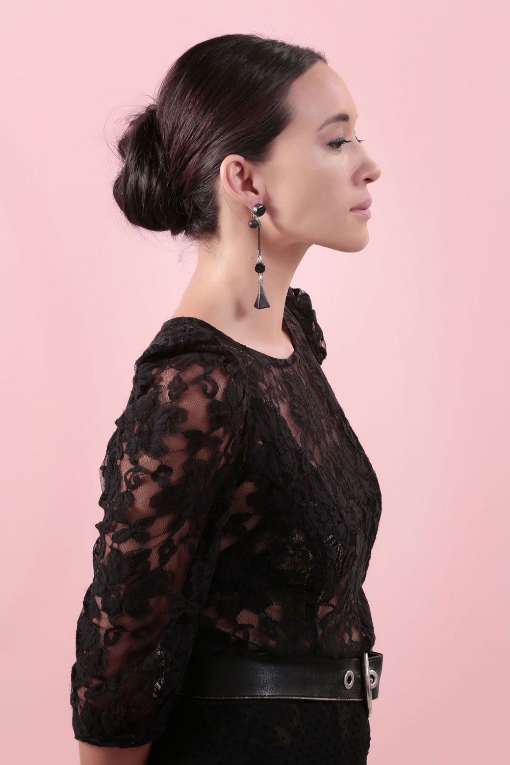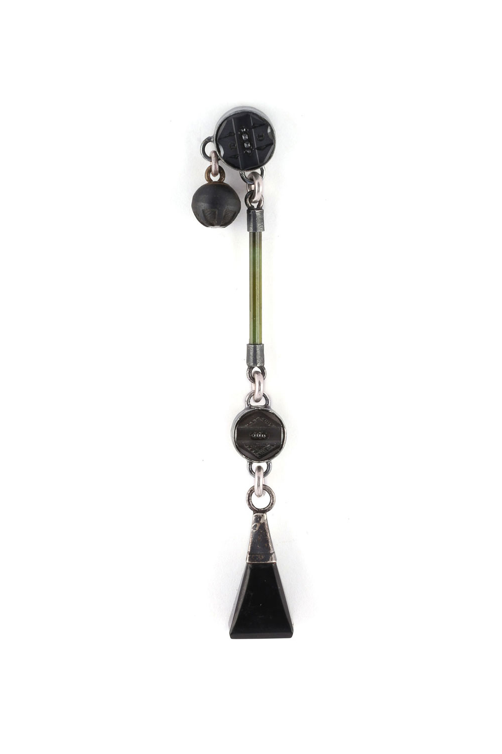 This earring can go with all other earrings in the collection.  Such a compatible piece.  Antique Jet tower charm with sterling silver, three black Victorian glass buttons with sterling silver, deep green tourmaline with sterling silver caps.