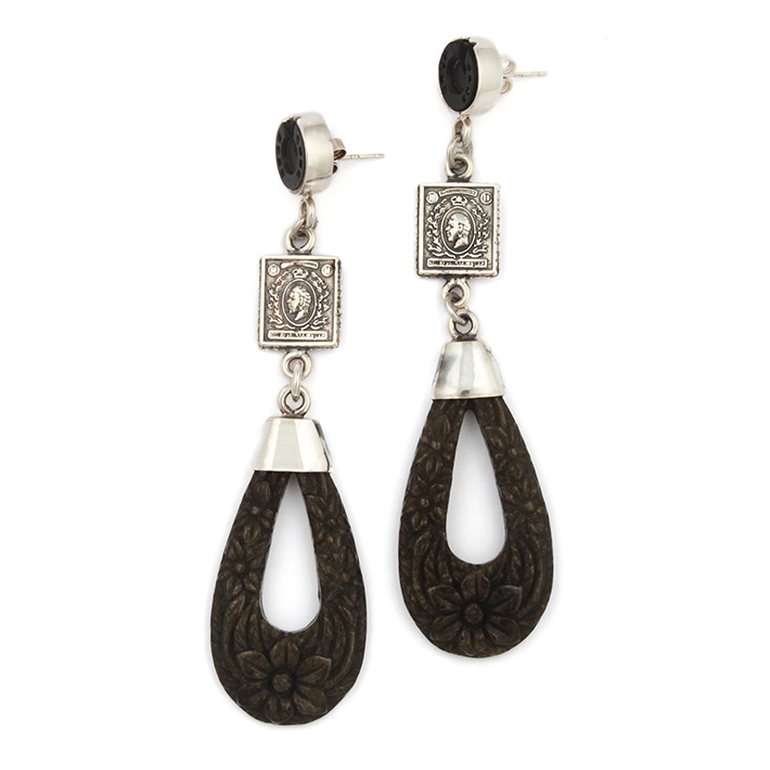 Carved green quartz in sterling silver, KT KEEP UP double sided sterling silver coin stamp, black carved horse shoe resin in sterling silver earring studs. Limited Edition. 2 pairs available.