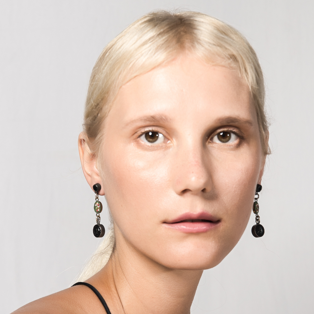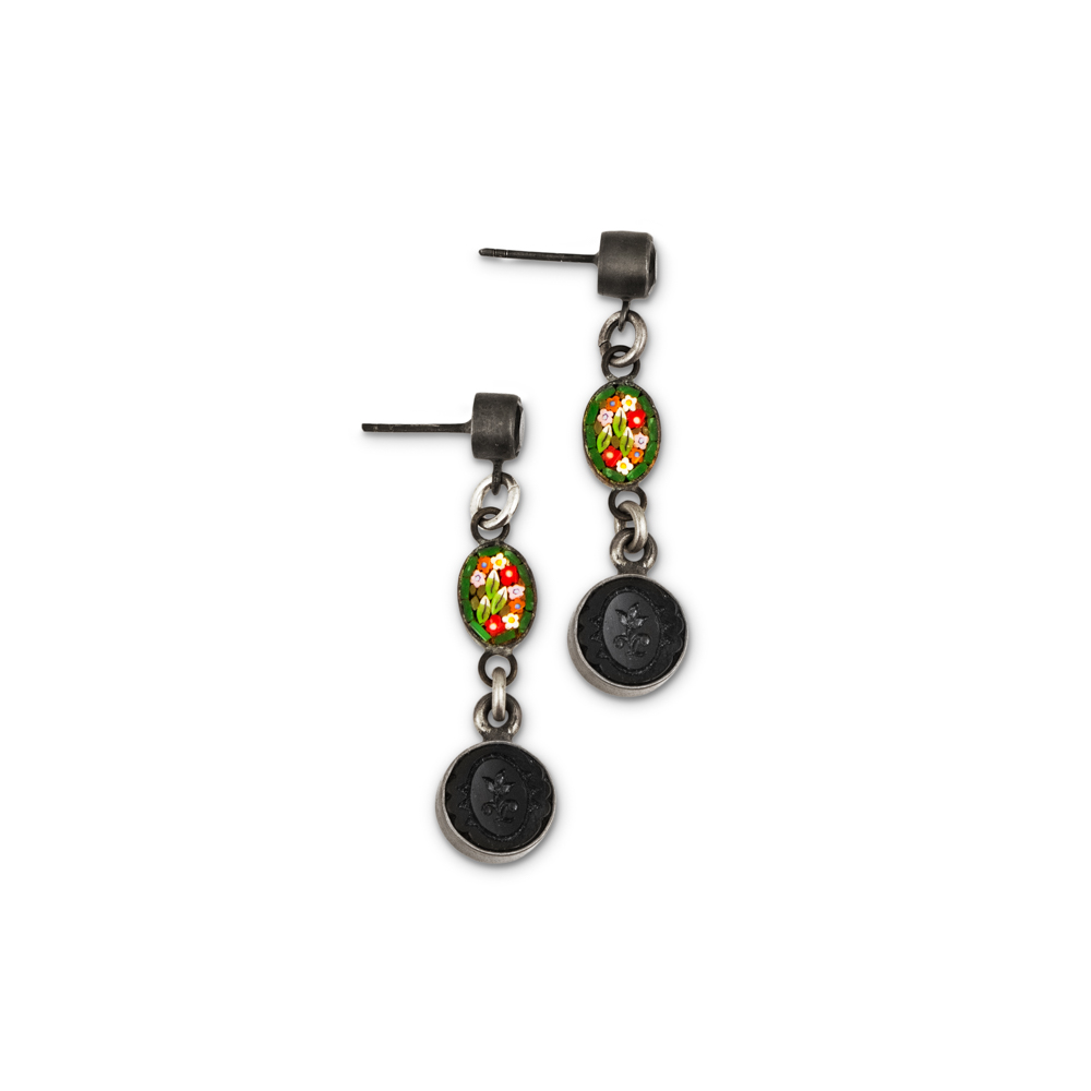 Victorian black glass motif buttons in sterling silver frames, Italian 1950s glass mosaic, black onyx in sterling silver earring studs. ONE OF A KIND.