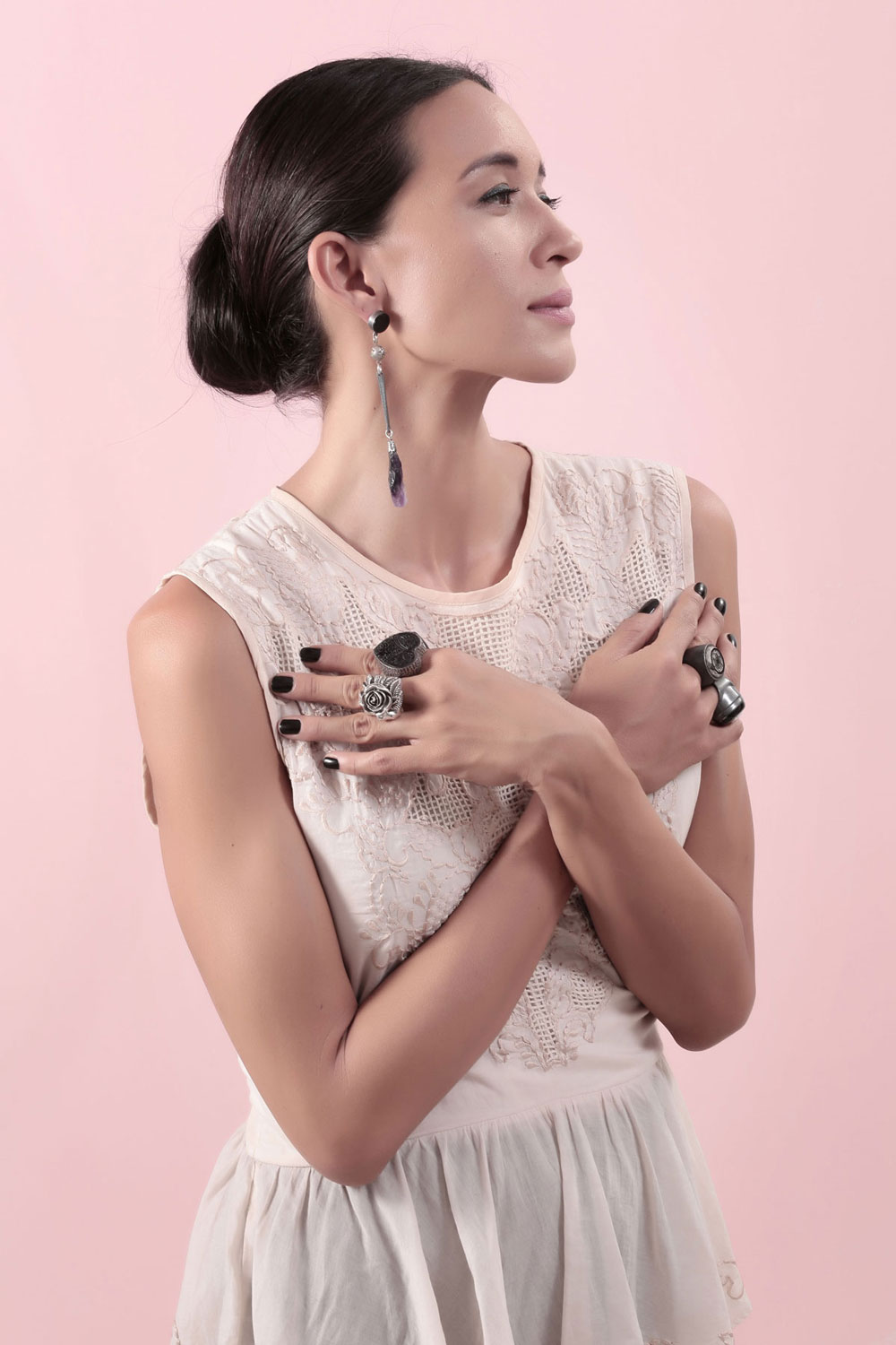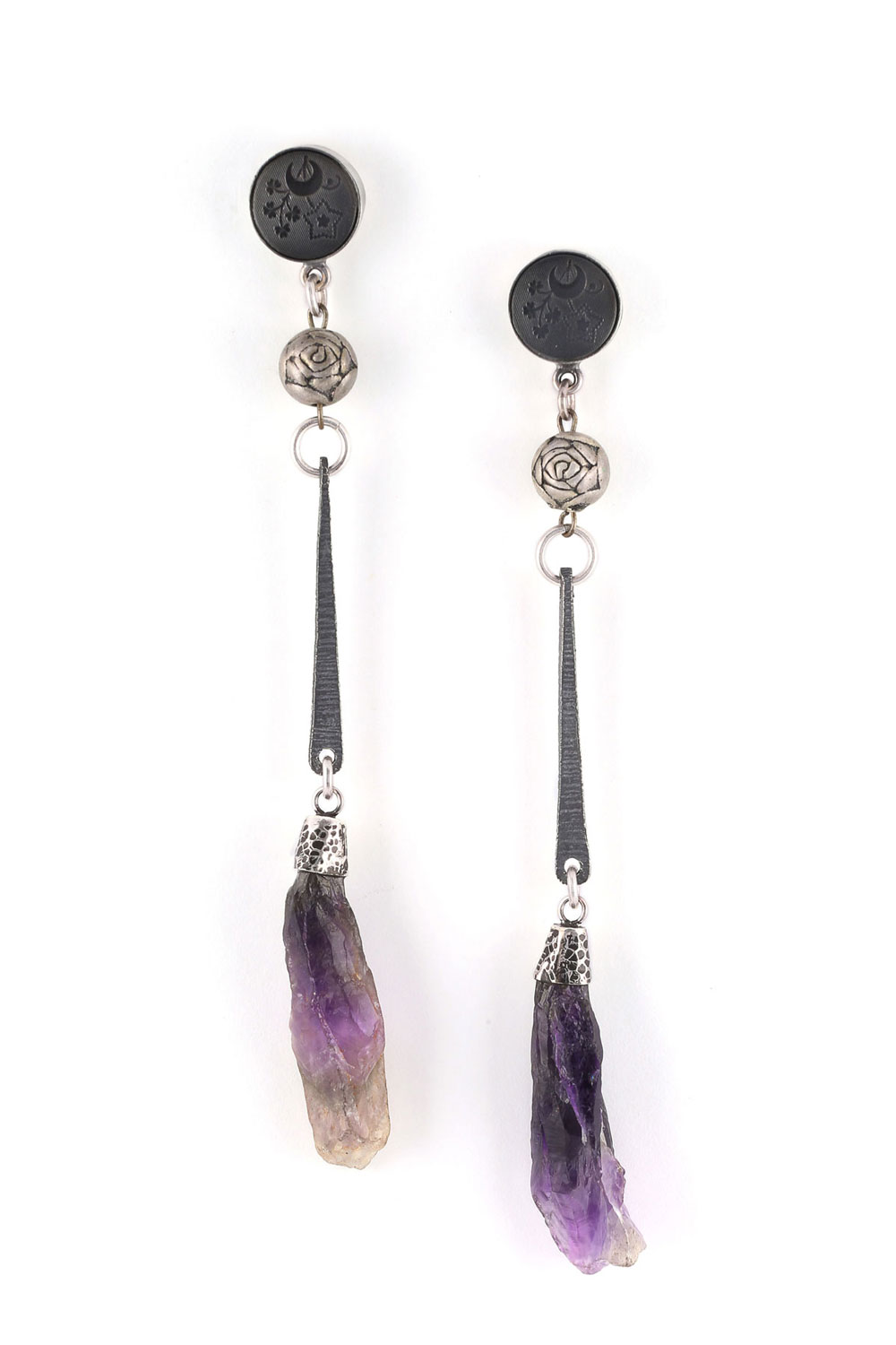 African amethysts in sterling silver caps, sterling silver and silver rose rosary beads, Victorian glass buttons in sterling silver frame studs.